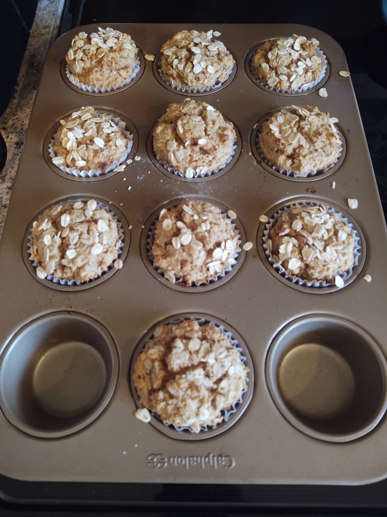 Mix all wet ingredients together in a bowl. Then add in the dry ingredients just until mixed. Add the oats on top for a garnish.